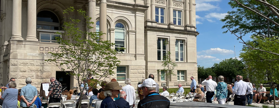 On Tuesday Mary 17, 2022, the first phase of the Turn to the River project was dedicated at a public ribbon cutting. The ‘Celebrate Room’ provides a fitting formal backdrop to the impressive governmental structures. This space, between the Terre Haute City Hall and Vigo County Courthouse, is intended to accommodate formal gatherings, and small receptions and be a backdrop to civic service. A central element in the room is the desire for the use of both a water feature and signature art installation provided by Brad and Diana Goldberg.