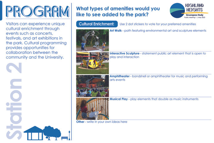 Highland Heights is developing a new greenspace plan for the public open space area adjacent to the municipal campus. Specific areas of focus for this greenspace exploration study focuses on community brainstorming sessions to identify interests and needs of the local residents for the improvements to the park space. As such, a series of community outreach workshops, survey’s and steering committee discussions were held to better identify the potential uses and unique amenities that would add value to the community. A Visioning Session and community picnic was facilitated in the park to provide an opportunity for residents to share input and feedback related to programming and facility enhancements. The goal of the Greenspace Study is to enhance this space for the community by creating a public amenity for everyone to enjoy. A preferred concept plan with feasibility recommendations related to funding and project phasing will be included as part of the study’s implementation recommendations.